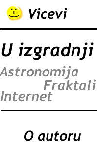u razvoju, ali je zato dovrsen dio viceva, kojeg isto uskoro ocekuje redizajn! ![]() Trenutacno intenzivno radimo na realizaciji naseg site-a posvecenog astronomiji, kojeg biste mogli ugledati dovrsenog vec za nesto manje od dva mjeseca. Zelimo vam ugodno surfanje!